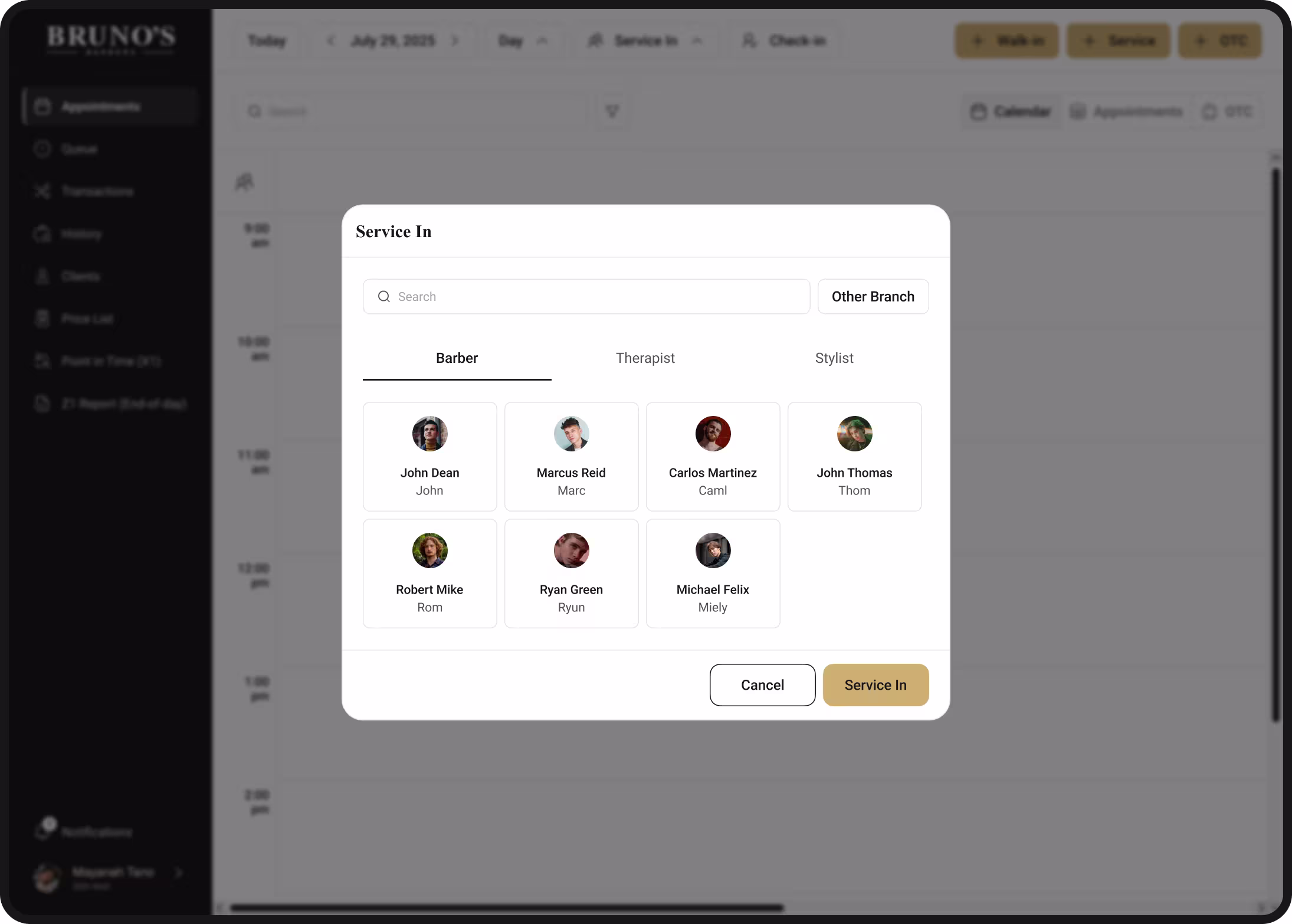 A real-time appointment system that gives the team full visibility of the day. The calendar layout allows staff to view bookings by time, service, and assigned barber, making scheduling clear and predictable.