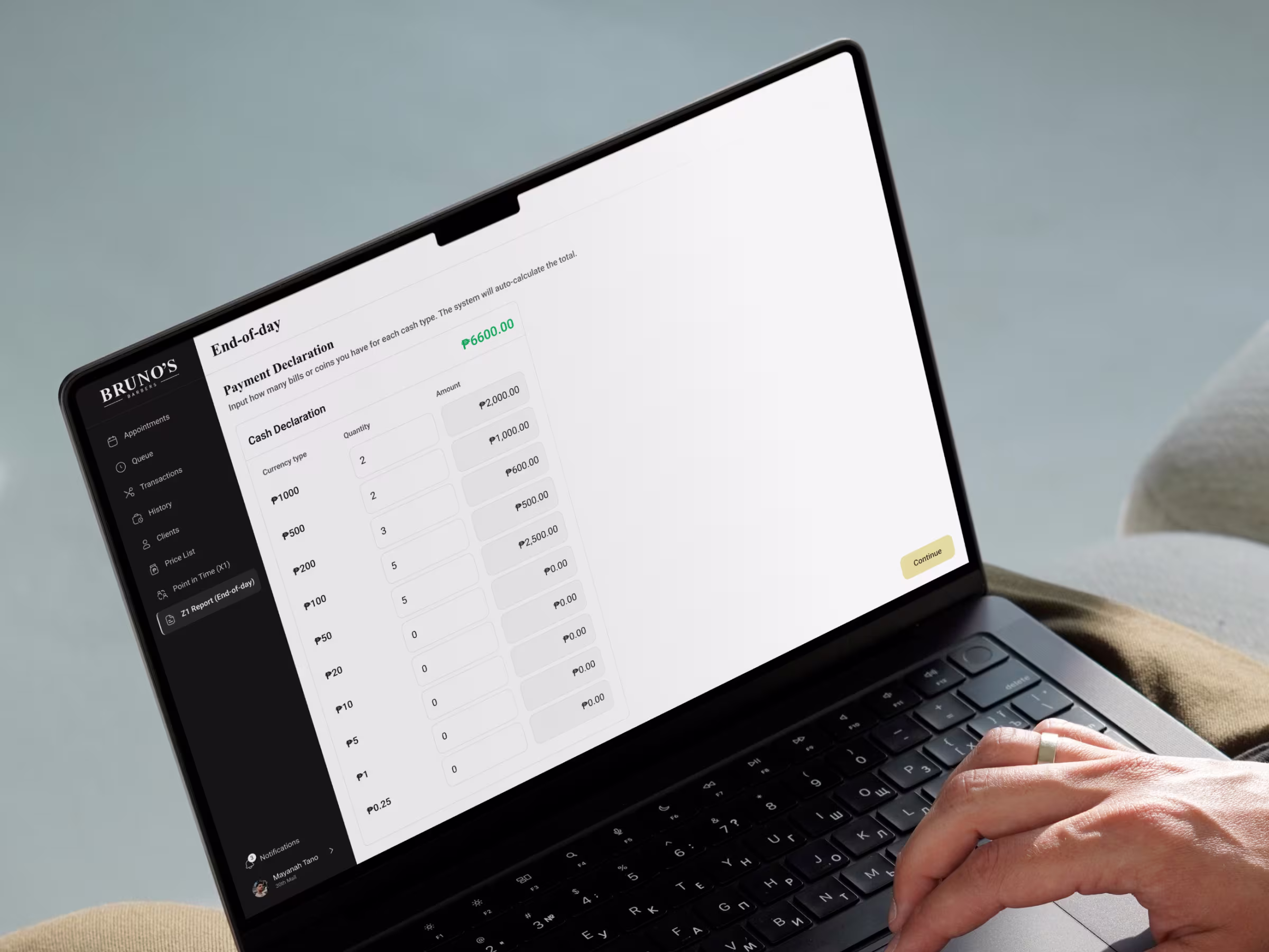 The interface allows staff to quickly review financial data, enter payment details, and close the day with clarity and confidence.