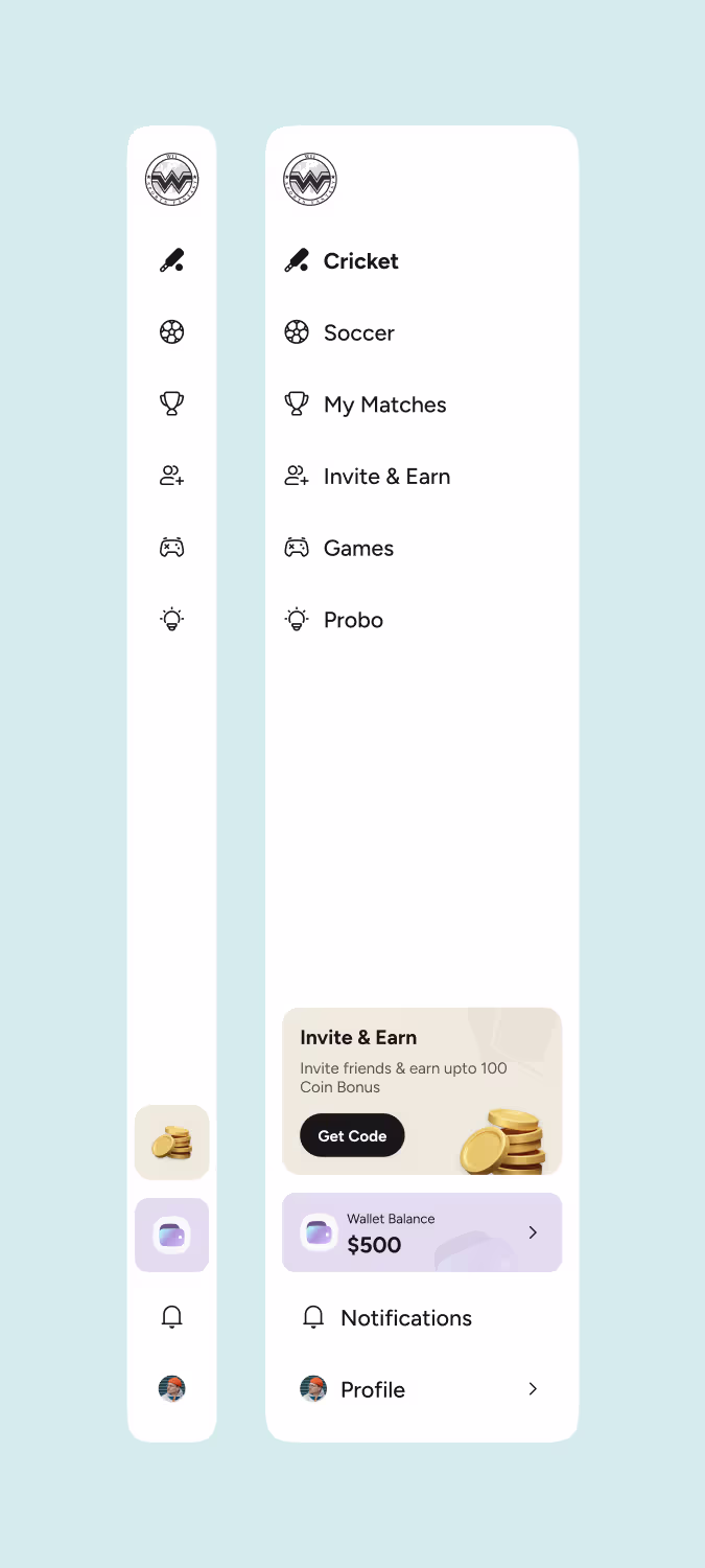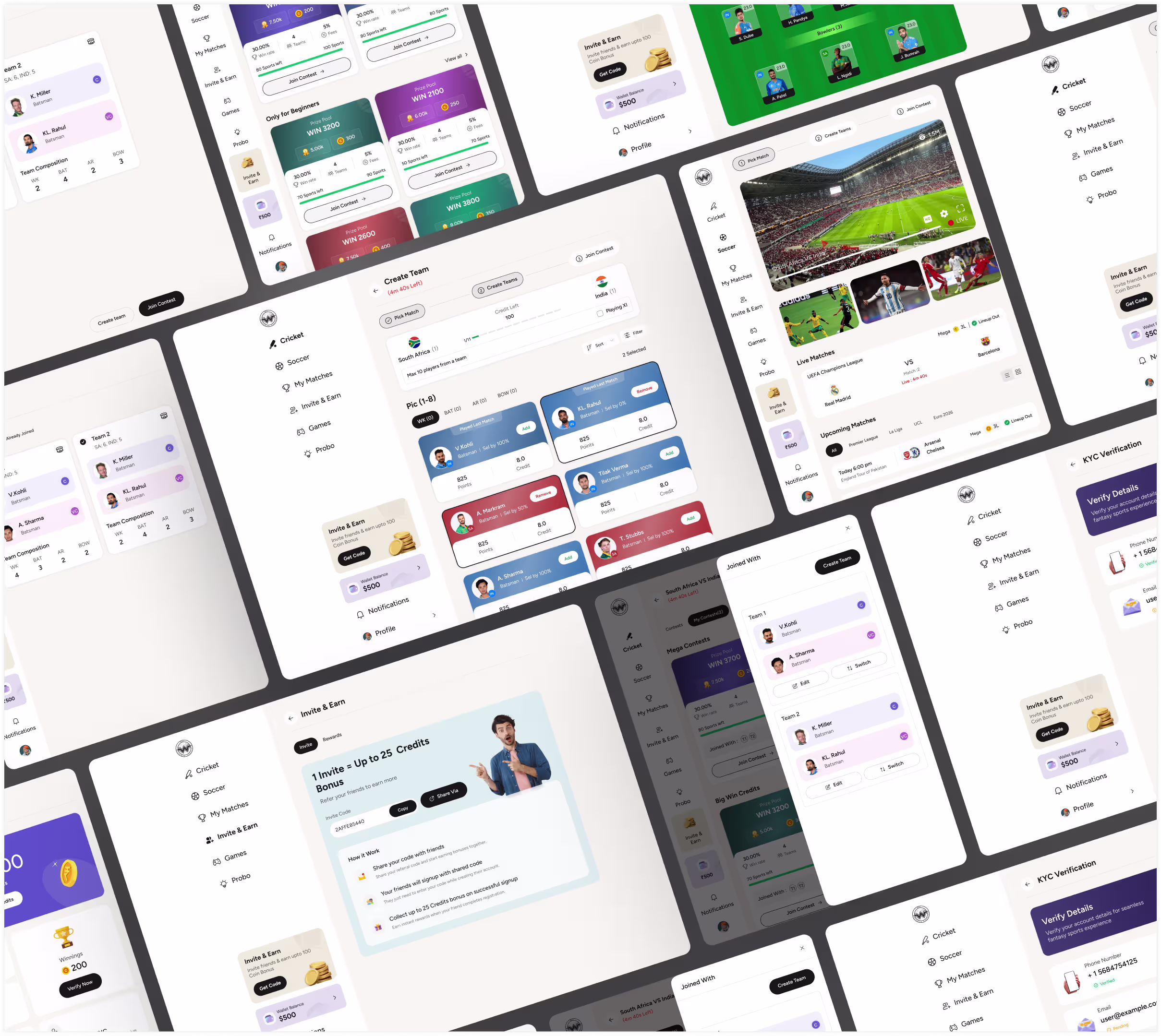 This section highlights the core cards and UI elements that shape the overall experience. From match cards and player selection tiles to wallet balance, invite banners, and navigation panels, each component was designed with consistency and clarity in mind.